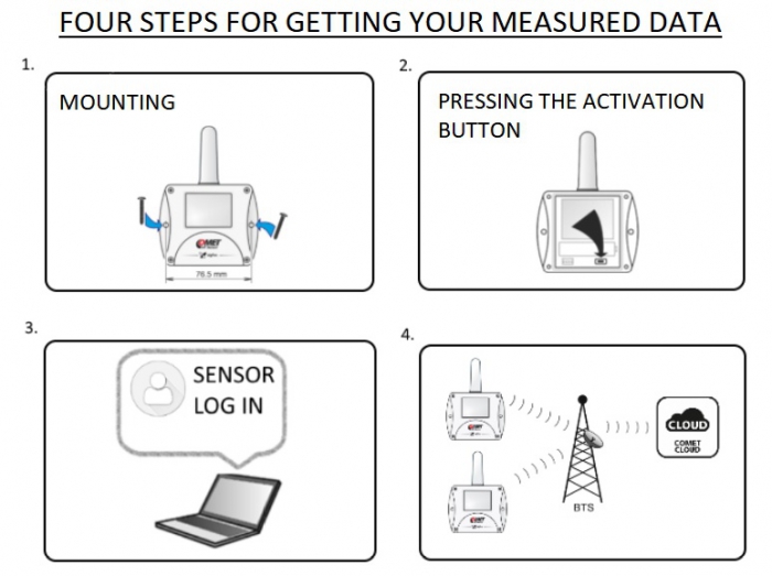 The measured values are sent in an adjustable time interval (10 min to 24 h) by radio transmission in the Sigfox network to the COMET Cloud, from which the user can view them using a personal computer or mobile device.