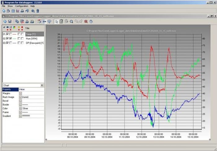 Data can be viewed and printed as table or graph. It it also possible to export the data to DBF or TXT files. You can change the axis and select any time range to view or print out the data. It is allowed to zoom the graph, modify the drawing width and the its color. It is also possible to separate the quantities from each other and print some of them or all of them separately.